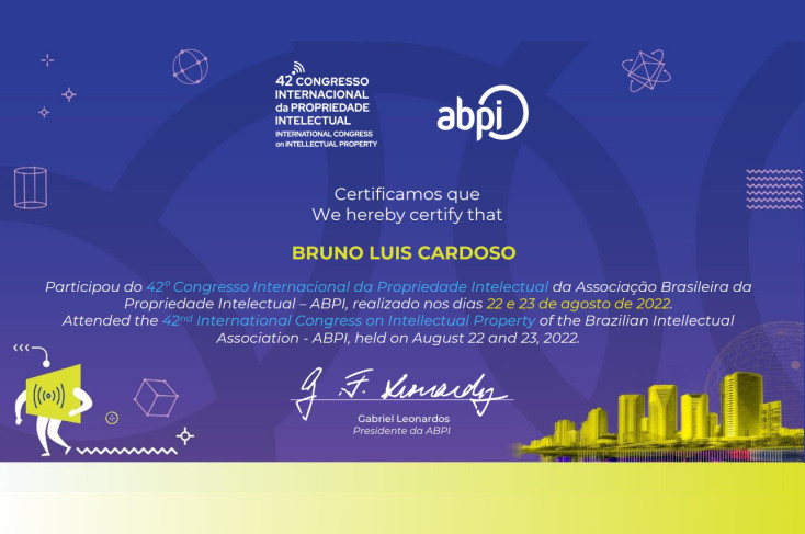 Nos dias 22 e 23 de agosto de 2022, nosso advogado titular, Bruno Cardoso Niehues, participou do 42º Congresso Internacional da Propriedade Intelectual, realizado pela Associação Brasileira da Propriedade Intelectual (ABPI) em São Paulo.